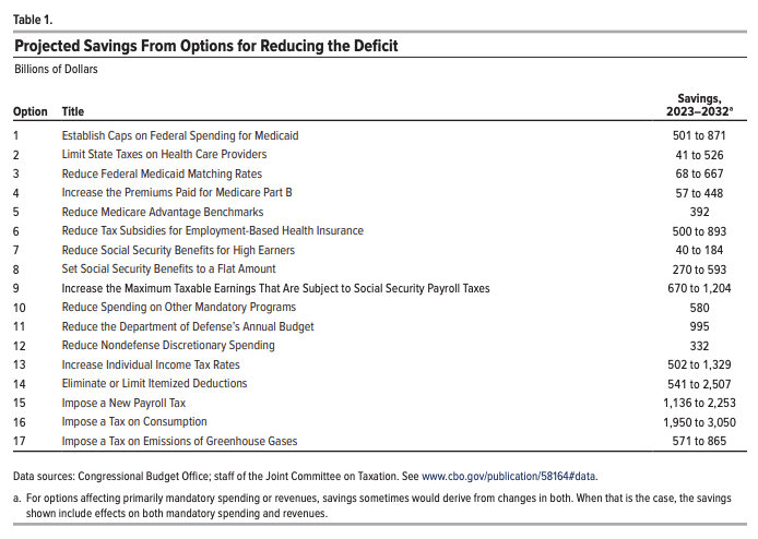 In this table from the Dec 2022 OMB analysis of options to reduce the deficit, it is notable that most of the options involve cuts to Medicare and Medicaid.